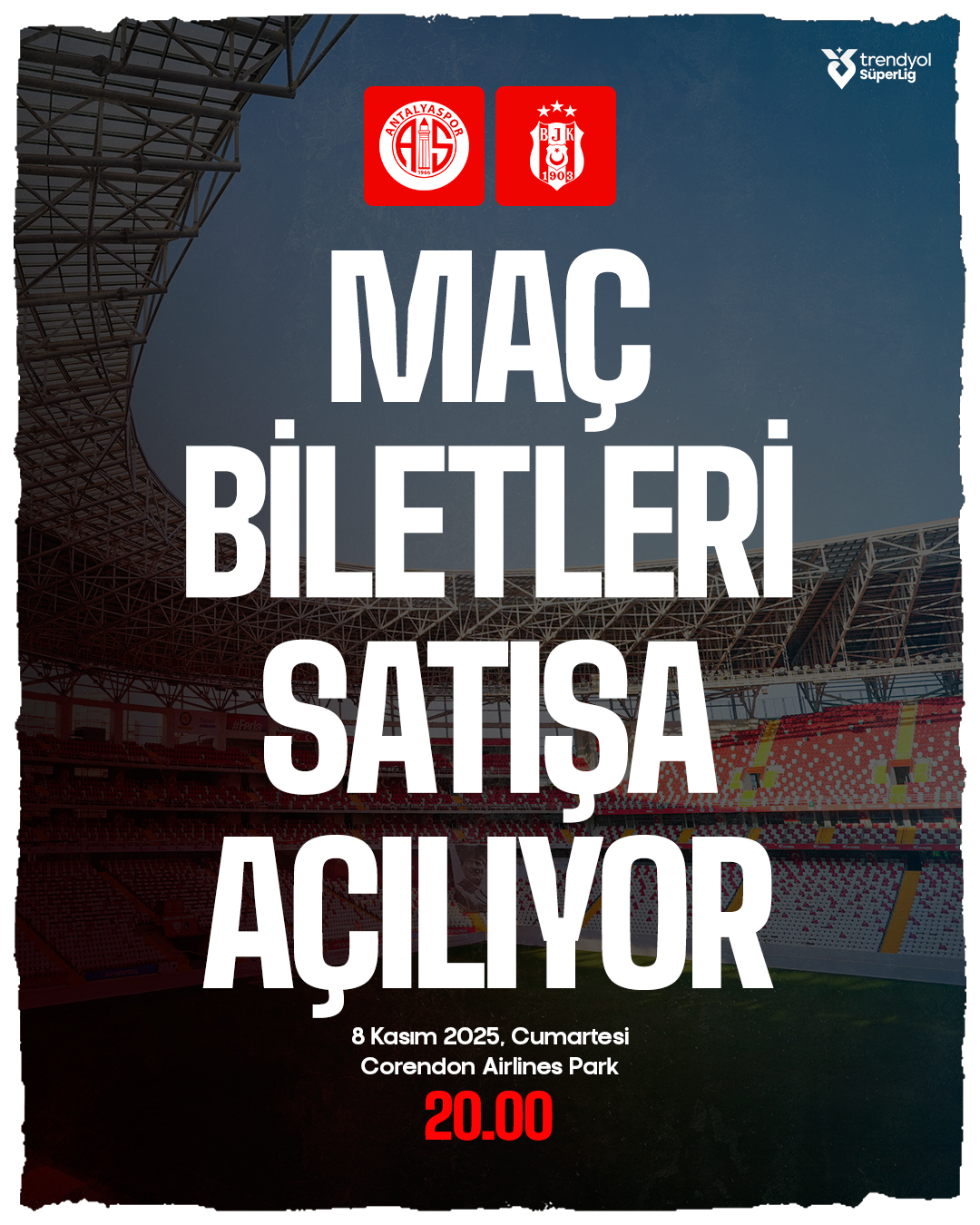Trendyol Süper Lig’in 12. haftası, futbolseverlerin merakla beklediği kritik bir mücadeleye sahne olacak. Antalyaspor, kendi sahası Corendon Airlines Park’ta dev derbide Beşiktaş’ı konuk etmeye hazırlanıyor. Antalyaspor Kulübü, resmi sosyal medya hesapları üzerinden yaptığı duyuru ile bu önemli karşılaşmanın bilet satış tarihlerini ve fiyatlandırmasını kamuoyuyla paylaştı.