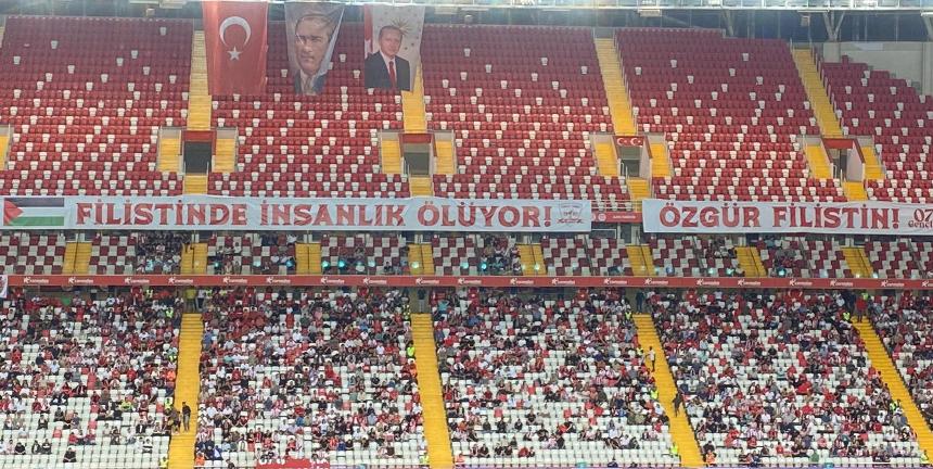 Mücadelede saha içindeki heyecan kadar tribünler de dikkat çekti. Antalyaspor taraftarları, Filistin’e destek pankartları açtı. Tribünlerde, “Filistin’de insanlık ölüyor, Özgür Filistin” yazılı pankartlar yer aldı.