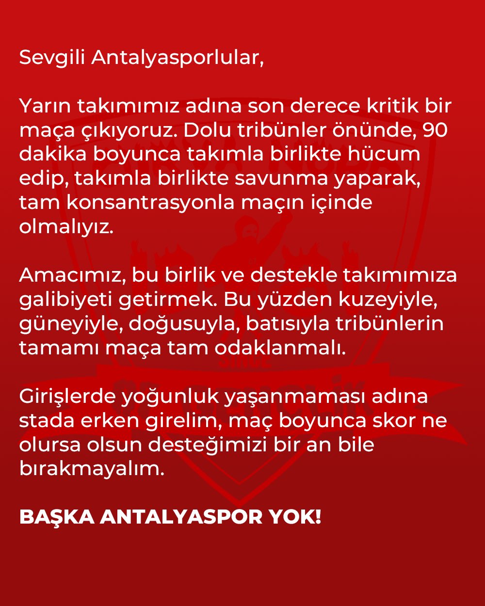 Taraftarlara stadyuma girişlerde yaşanabilecek yoğunluğa karşı uyarıda bulunan 07 Gençlik, "Girişlerde yoğunluk yaşanmaması adına stada erken girelim, maç boyunca skor ne olursa olsun desteğimizi bir an bile bırakmayalım" dedi. Açıklama, "BAŞKA ANTALYASPOR YOK!" sloganıyla sonlandırıldı.