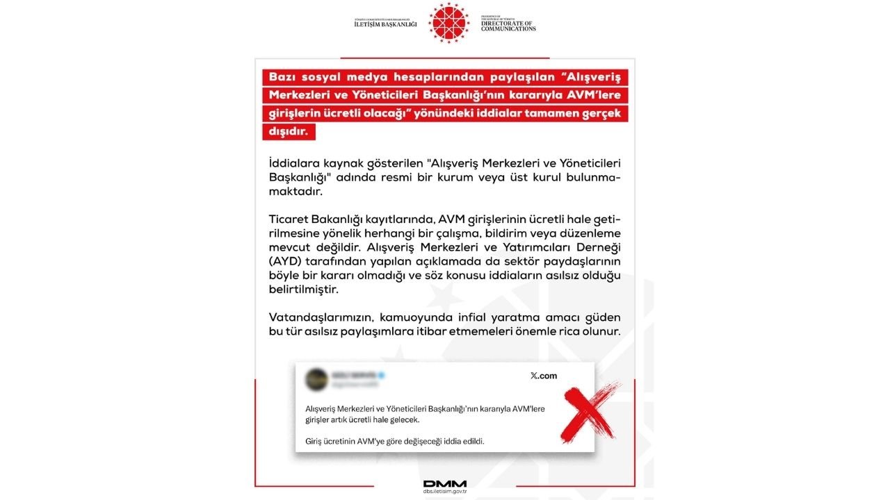 Cumhurbaşkanlığı İletişim Başkanlığı Dezenformasyonla Mücadele Merkezi (DMM), son günlerde sosyal medyada hızla yayılan “AVM girişleri ücretli olacağı” yönündeki iddialara ilişkin açıklama yaptı. Yapılan duyuruda söz konusu iddiaların tamamen asılsız olduğu belirtildi.