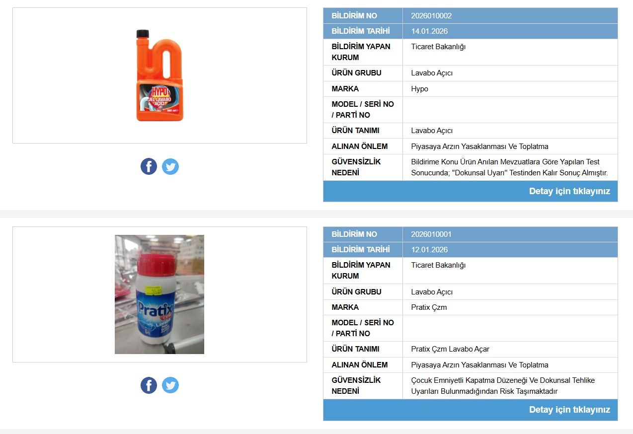 Bakanlık tarafından yapılan incelemelerde, Hypo ve Pratix markasına ait lavabo açıcısı ile Best markasına ait yağ çözücünün insan sağlığı için risk taşıdığı ve güvenlik standartlarını karşılamadığı tespit edildi. Ürünün satışı yasaklanırken, halihazırda raflarda bulunan ürünlerin toplatılmasına karar verildi.