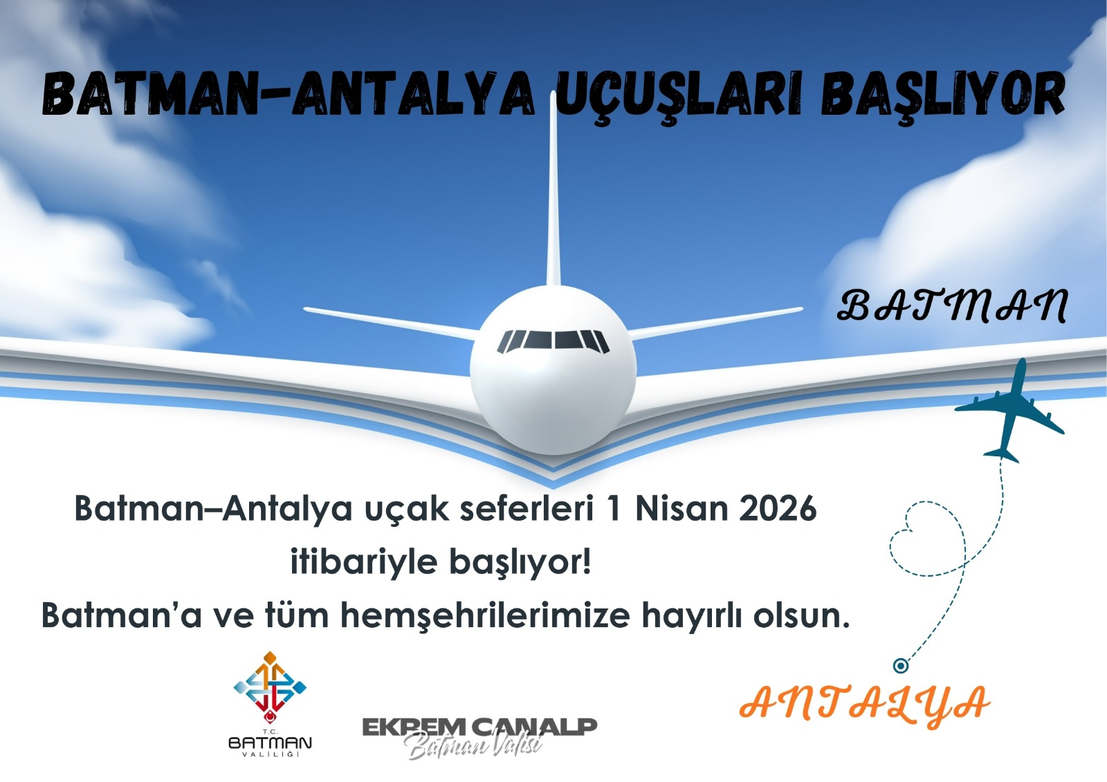 Batman Valiliği'nden yapılan açıklama ile, Batman-Antalya uçak seferlerinin 1 Nisan 2026 tarihi itibariyle başlayacağı duyuruldu. SunExpress Havayolları tarafından karşılıklı olarak yapılacak uçuşlar, haftada iki gün (Çarşamba ve Cumartesi) düzenlenecek.