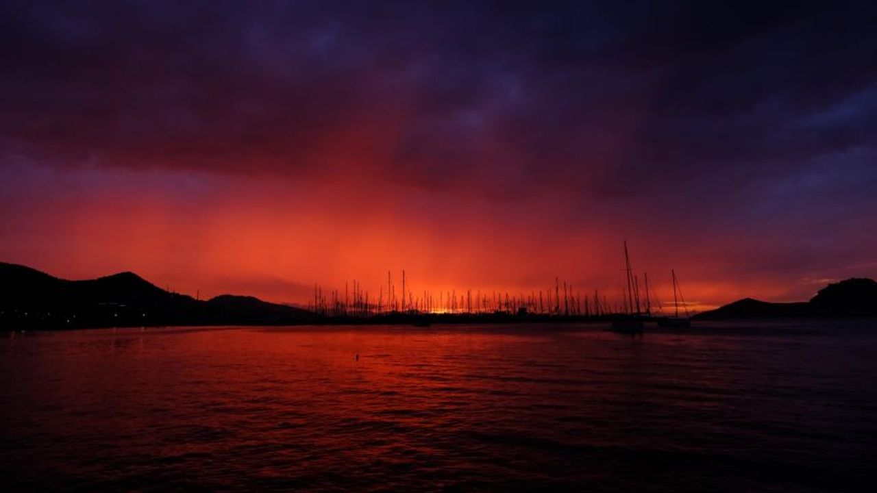 Muğla’nın Bodrum ilçesinde etkisini yitiren sağanağın ardından gökyüzünde güneşin batışıyla ortaya çıkan kızıl ağırlıklı renkler, güzel görüntüler oluşturdu. Yelkenli tekneler arasında ve denizin yansımalarıyla oluşan manzarayı, turistler de cep telefonlarıyla görüntüledi.
