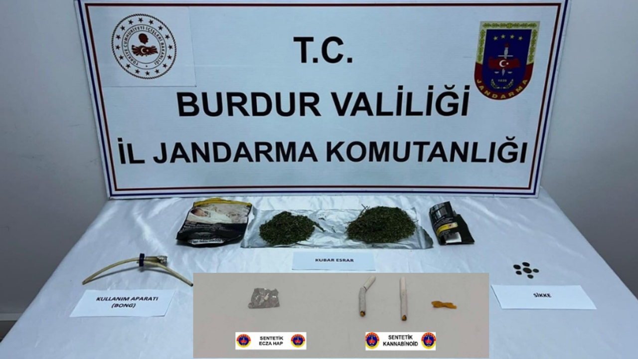 Burdur İl Jandarma Komutanlığı ekipleri tarafından 14-24 Kasım tarihlerinde Bucak, Gölhisar ve Yeşilova Cumhuriyet Başsavcılıkları koordinesinde il genelinde çalışma gerçekleşti. Yapılan çalışmalarda, 32 gram kullanımlık kannabinoid/bonzai, 4 gram metamfetamin, 95 gram kubar esrar, 1 adet sentetik ecza, 6 adet uyuşturucu madde kullanma aparatı ele geçirildi. Olayla ilgili M.G., O.K., Y.Y. ve Y.A. isimli 4 şahıs gözaltına alındı.