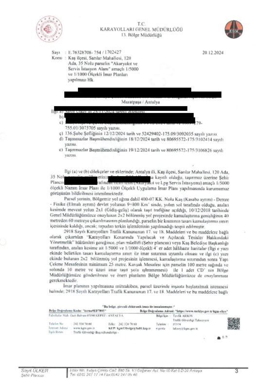 Yeni yapılması planlanan bölünmüş yol projesinin istimlak sınırında bulunan tarlanın vasfını değiştirerek akaryakıt ve servis istasyonu alanı olarak plana işletilmesi için Antalya Büyükşehir Belediyesi’ne yapılan başvurunun, Meclis Üyesi Nazmi Gündüz’ün önerisi ile Meclise sunulduğu, 10 Mart 2025 tarihli Meclis toplantısında yapılan oylamada ilgili komisyona havale edildiği öğrenildi.