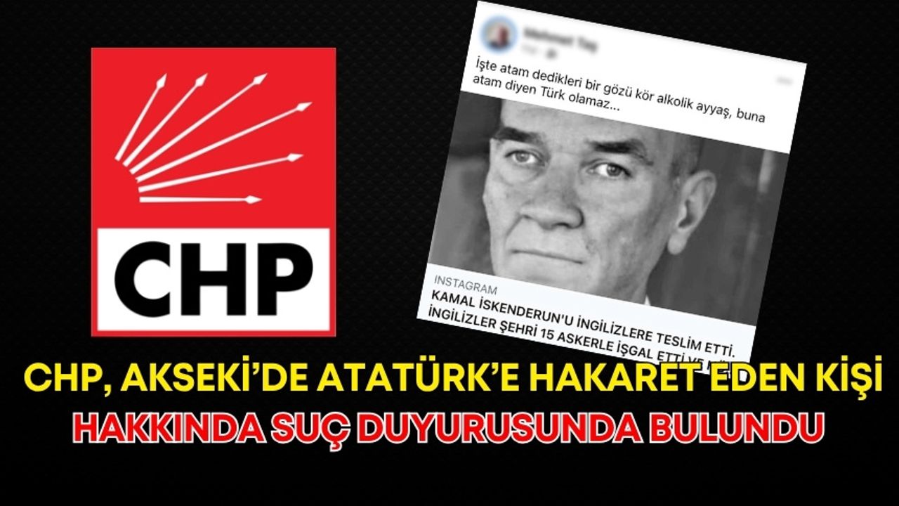 Cumhuriyet Halk Partisi Akseki İlçe Başkanı Hasan Erdem, Atatürk’e yönelik hakaret içerikli paylaşım yapan M.A. hakkında suç duyurusunda bulunduklarını ifade etti. Erdem, “Ülkemizin kurucu lideri Gazi Mustafa Kemal Atatürk hakkında sosyal medya hesabından hakaret içerikli paylaşımlar yapan M.A. adlı kişi hakkında, Cumhuriyet Savcılığına suç duyurusunda bulunduk. Süreci hukukçu arkadaşlarımızla birlikte titiz bir şekilde takip edeceğiz” şeklinde konuştu.