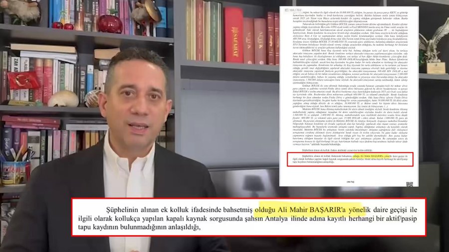 H.T.A., ek ifadesinde Muhittin Böcek’in adaylık sürecinde kendisine destek veren Ali Mahir Başarır’a bir daire hediye etmek istediğini ve 2024 yerel seçimleri döneminde 10 milyon TL nakit parayı elden teslim ettiğini ileri sürdü. İddiaların odağındaki Ali Mahir Başarır ise yaptığı açıklamada, savcılık incelemesinde Antalya’da adına kayıtlı hiçbir taşınmazın bulunmadığının tespit edildiğini hatırlatarak, “Alnım ak, tüm kayıtlarım incelensin. Bu iftirayı atan şahıs hakkında suç duyurusunda bulunuyorum” diyerek iddiaları yalanlamıştı.