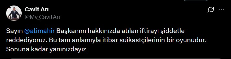 Resmi sosyal medya hesabı üzerinden kamuoyuna seslenen Arı, Başarır’a yönelik iddiaların asılsız olduğunu belirterek, “Sayın Ali Mahir Başarır Başkanım, hakkınızda atılan iftirayı şiddetle reddediyoruz. Bu tam anlamıyla itibar suikastçılarının bir oyunudur. Sonuna kadar yanınızdayız” ifadelerini kullandı.