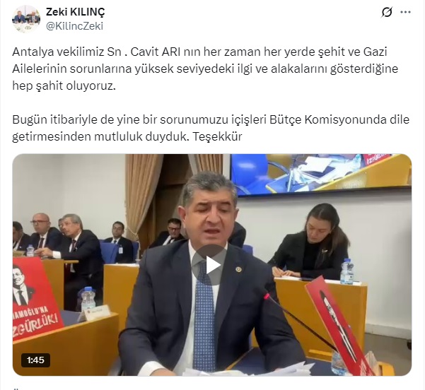 Cumhuriyet Halk Partisi (CHP) Plan ve Bütçe Komisyonu Üyesi ve Antalya Milletvekili Cavit Arı, İçişleri Bütçe Komisyonu'nda söz aldı. Arı, bu kez şehit ve gazi ailelerinin yaşadığı sorunlara dikkat çekerek önemli açıklamalarda bulundu.