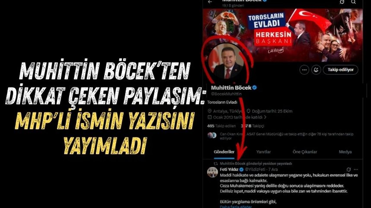 Paylaşımı dikkat çekici kılan unsur ise açıklamanın sahibi ile paylaşan kişi arasındaki parti farkı oldu. Mesaj, Cumhur İttifakı ortağı MHP'nin Genel Başkan Yardımcısı Feti Yıldız'a aitken, bunu paylaşan isim ise CHP'li Antalya Büyükşehir Belediye Başkanı Muhittin Böcek oldu.