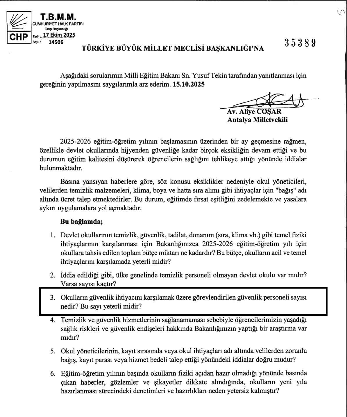 Eğitim sendikalarının "ders başı yapmama" çağrısında bulunduğu bu dönemde, CHP Antalya Milletvekili Avukat Aliye Coşar'ın 15.10.2025 tarihli ve 14506 sayılı soru önergesi facianın ihmaller zinciriyle geldiğini kanıtlar nitelikte. Antalya Milletvekili Aliye Coşar, Yusuf Tekin'e hitaben yazdığı önergede şu kritik soruları yöneltmişti: