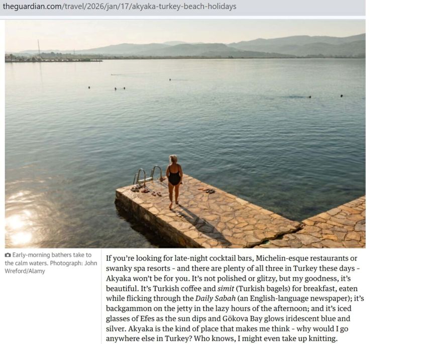 Thorpe, Akyaka'da büyük ve her şey dahil otellerin bulunmamasının, yerel yaşamın korumasında önemli rol oynadığını, ziyaretçilerin Azmak Nehri kıyısındaki balık restoranlarında vakit geçirdiğini, orman içi patikalarda yürüyüş yaptığını ve sahilde sakin bir tatil deneyimi yaşadığını aktardı. Thorpe'un yazısında Akçapınar Plajı da öne çıktı. Mayıs-Kasım ayları arasında etkili olan rüzgarlar sayesinde bölgenin kite sörfü ve wingfoiling için Türkiye'nin önemli merkezlerinden biri haline geldiği belirtildi. Sığ ve kumluk yapının özellikle yeni başlayanlar için ideal olduğu vurgulandı.