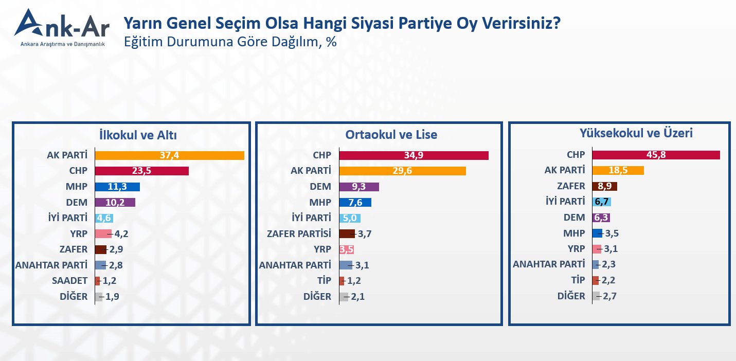 Ank-Ar araştırmasının eğitim durumuna göre dağılım tablosu, seçmen tercihlerinin eğitim seviyesi ile olan ilişkisini ortaya koydu.