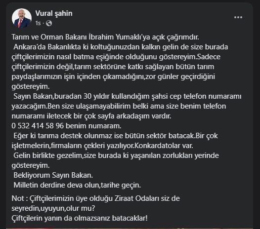 İki dönem Ziraat Mühendisleri Odası Antalya Şube Başkanlığı yapan Vural Şahin, sosyal medya hesabından Tarım ve Orman Bakanı İbrahim Yumaklı’ya seslendi. Şahin, cep telefonunu Bakan Yumaklı'ya çağrıda bulundu.