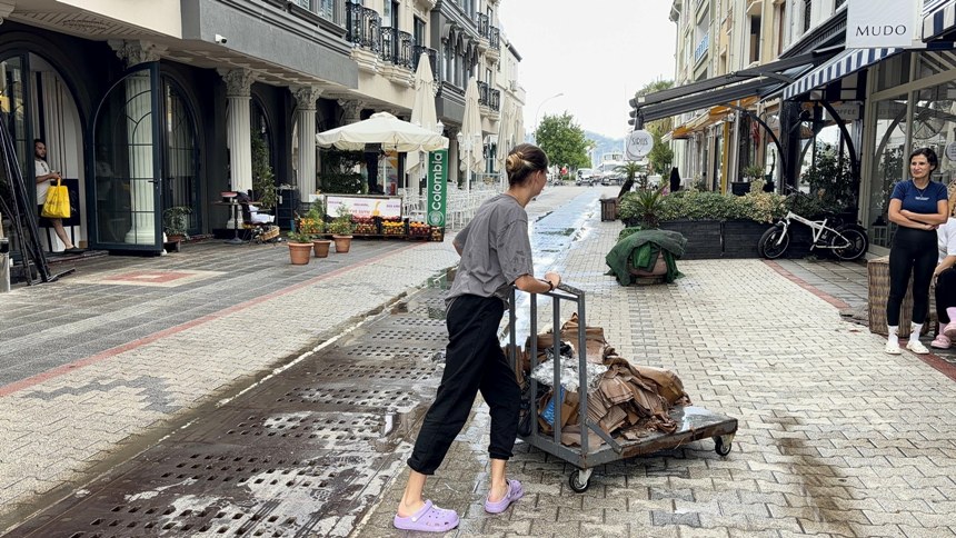 Fethiye'de dün akşam saatlerine kadar süren sağanak yağışın ardından, temizlik çalışmalarına başlandı. Sabah saatlerinde, sular altında kalan 70 iş yeri sahibi, belediye ekipleriyle birlikte iş yerlerinde temizlik yaptı. Özellikle Dispanser Sokak ve çevresinde etkili olan yağış, cadde ve dükkanlarda biriken çamurları belediye ekiplerinin temizlemesiyle giderildi. Belediye görevlileri, zarar gören eşyaların dışarı çıkarılmasına yardımcı oldu.