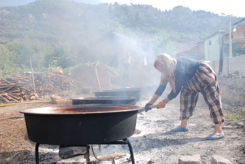 Ürünlü Mahallesi sakinleri, sarp arazilerde yerlere düşen kozalakları çuvallarla köylerine taşıyor. Toplama işleminin ardından kasım ve aralık aylarında pekmez yapımına başlanıyor. Süreç, imece usulüyle yürütülerek köy kültürünü yaşatıyor.