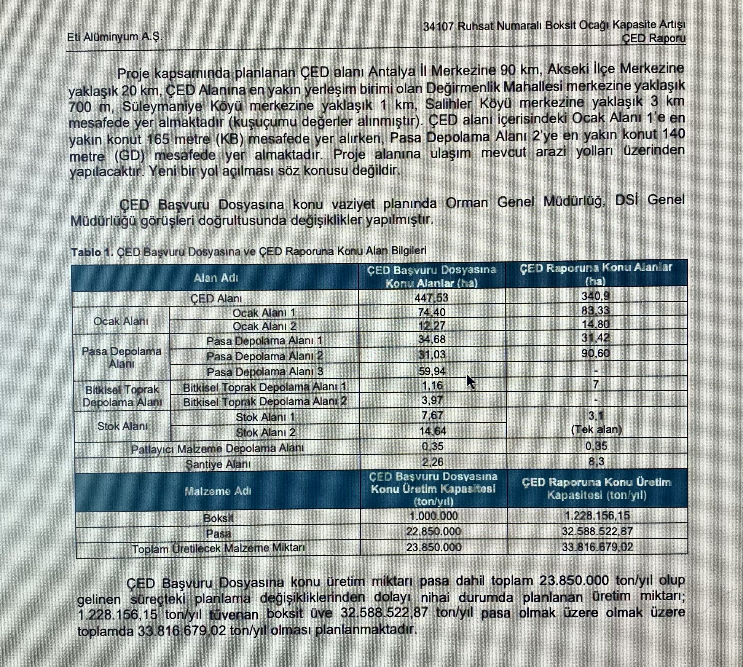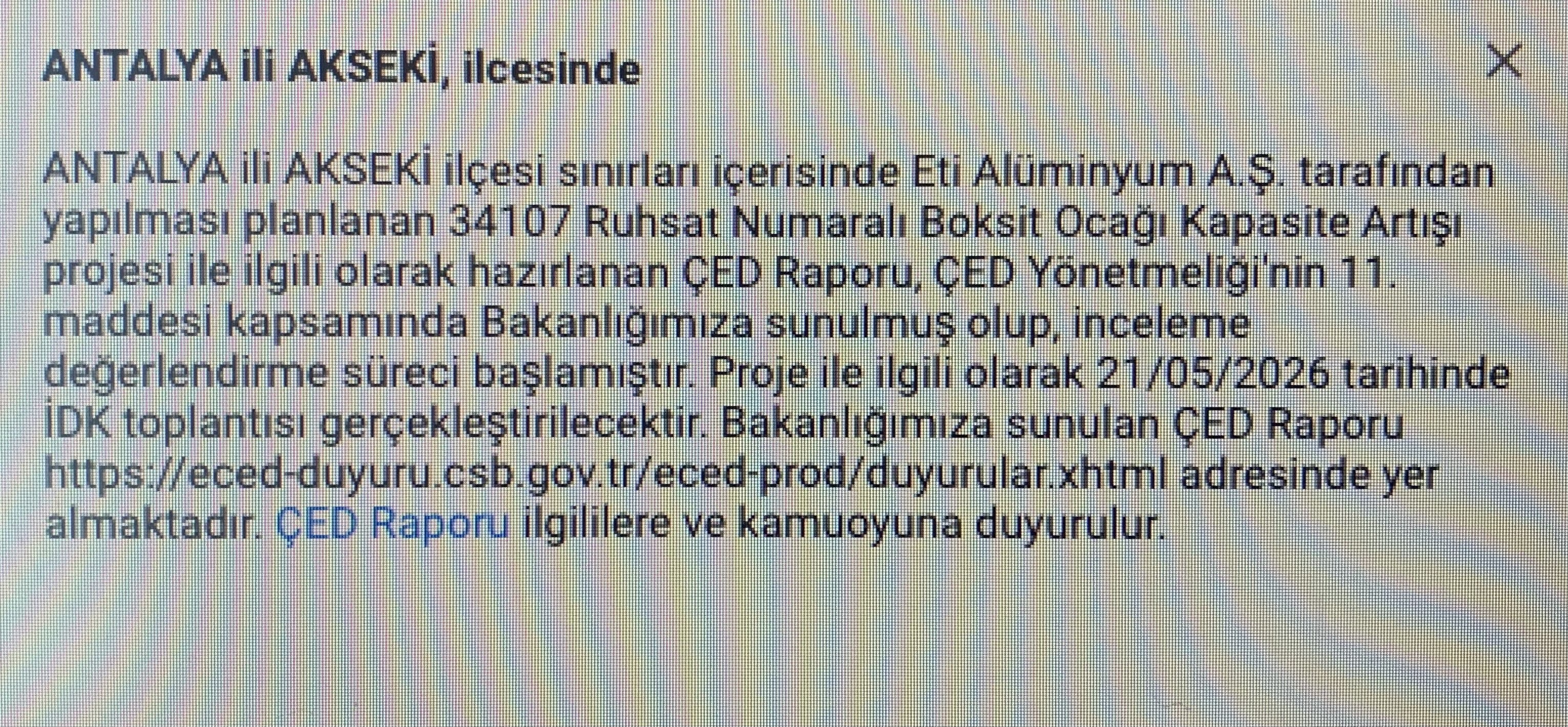 Eti Alüminyum A.Ş bünyesinde kullanılan boksit cevheri için Antalya’nın Akseki ilçesi sınırları içerisinde toplam 792,99 hektarlık alanda maden işletme ruhsatı verildi. Ruhsat sahası içerisinde 3,4 milyon m2’lik alanda işletme izni verilen boksit maden ocağı için şirket kapasite artışına gitmek istiyor. İki yıldır devam eden projeyle ilgili ÇED sürecinde, 21 Mayıs 2026 tarihinde Ankara’da İDK Toplantısı yapılacak.