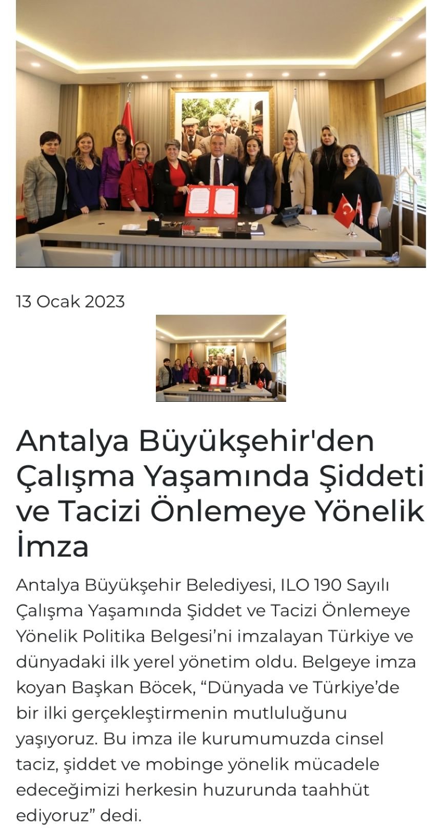 “Antalya Büyükşehir Belediyesi, İLO’nun 190 Sayılı Şiddet ve Tacizin Önlenmesi Sözleşmesi kapsamında 9 Ocak 2023 tarihinde tek taraflı olarak bir Politika Belgesi hazırlayıp, basın önünde gerçekleşen imza töreni ile iş bu politika belgesini kabul ederek imzalamıştır. Türkiye Kadın Dernekleri Federasyonu sadece diğer kişi ve kurumlarla birlikte basın önünde gerçekleşen bu imza törenine katılmıştır. Dolayısıyla Türkiye Kadın Dernekleri Federasyonu ile Antalya Büyükşehir Belediyesi arasında İLO’nun ilgili sözleşmesi çerçevesinde bir protokol bulunmamaktadır.”