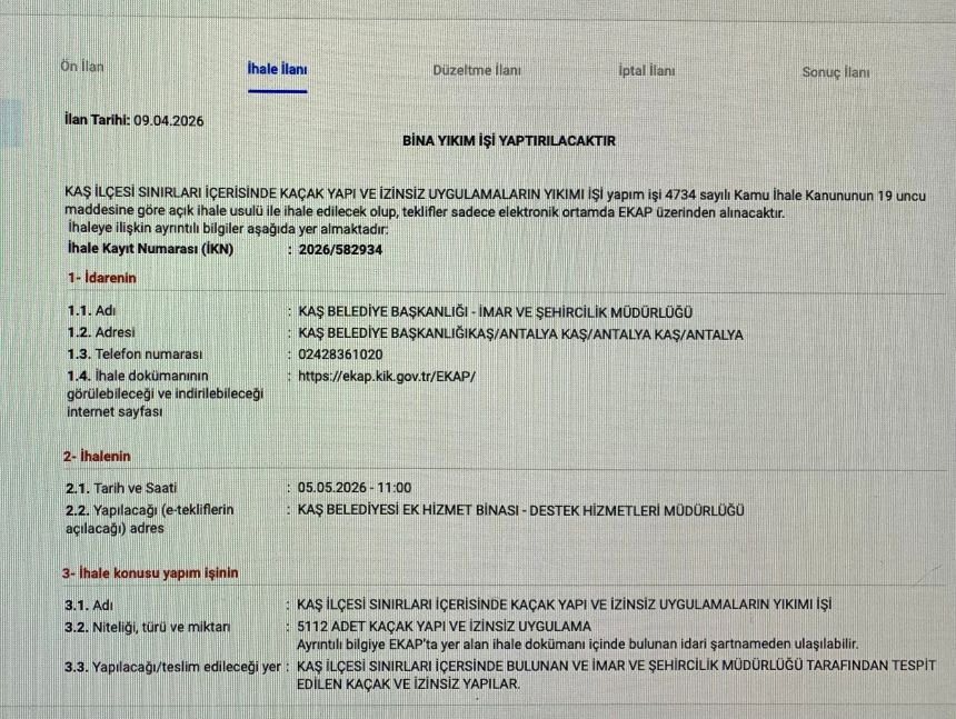 Antalya’nın Kaş ilçesinde yıllardır tartışılan kaçak yapı sorunu, yayımlanan resmî ihale ilanıyla yeniden gündeme geldi. Kaş Belediyesi, ilçe genelinde tespit edilen kaçak ve ruhsatsız yapıların yıkımı için 5 Mayıs’ta ihaleye çıkacak.
