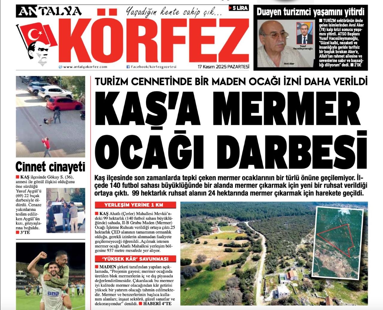 Antalya Kaş ilçesinde 1. derece arkeolojik sit alanı içerisinde mermer ocağına verilen ruhsat, çevre ve kültürel miras tartışmalarını yeniden gündeme taşıdı. Sahip olduğu orman ve doğal güzellikleri bakımından her yıl milyonlarca turist ağırlanan ilçede maden ocaklarının sayısının her geçen gün artması dikkat çekti. Çerler ve Ahatlı mahalleleri mevkiinde planlanan proje hem doğal yapısı hem de tarihi değerleriyle öne çıkan bölgede tepkilere neden oldu. Antalya Körfez Gazetesi’nin 17 Kasım 2025 tarihinde gündeme getirdiği “Kaş’ta Mermer Ocağı Darbesi” manşetli haberinin ardından projeye 6 Nisan 2026 tarihinde “ÇED Gerekli Değildir” kararı verildi. Kaş Çevre ve Kültür Derneği Başkanı Ahmet Murat Akoy, projeye sert tepki gösterdi.