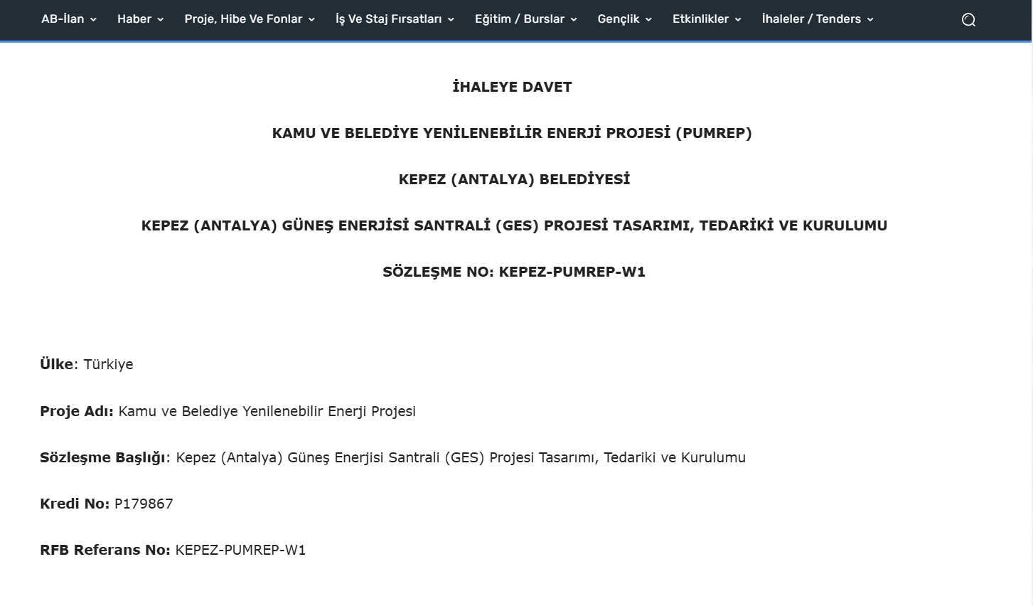 Kepez Belediyesi tarafından yayımlanan ihale ilanıyla birlikte, Güneş Enerjisi Santrali’nin tasarımı, gerekli ekipmanların tedariki ve kurulum işlemlerini kapsayan süreç resmen başladı. İhale süreci, Dünya Bankası’nın "Yatırım Projeleri Borçluları Tarafından Uygulanacak Satınalma Kuralları" çerçevesinde ulusal rekabetçi ihale yöntemiyle gerçekleştirilecek. Proje kapsamında ihaleyi kazanan yüklenici firmanın, işi teslim aldıktan sonra kusur sorumluluk süresi hariç olmak üzere toplam 210 takvim günü içerisinde santralin kurulumunu tamamlaması hedefleniyor.