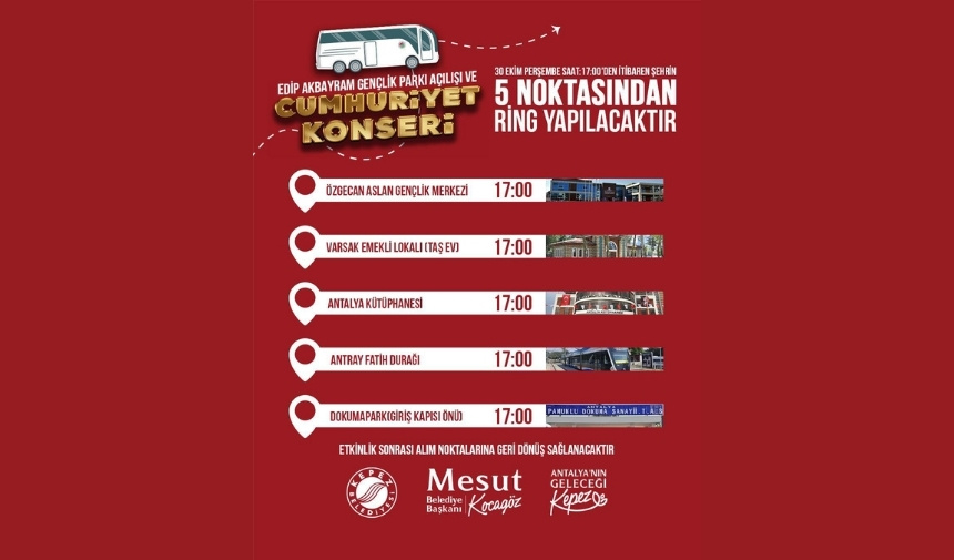 Kepez Belediyesi, Edip Akbayram Gençlik Parkı’nın açılışını ve Cumhuriyet’in 102. yıl coşkusunu, 30 Ekim Perşembe günü ünlü sanatçı Haluk Levent konseriyle taçlandıracak. Kepez Belediyesi, tüm halkın bayram sevincine ortak olabilmesi için şehrin 5 noktasından servis imkanı sağlayacak.