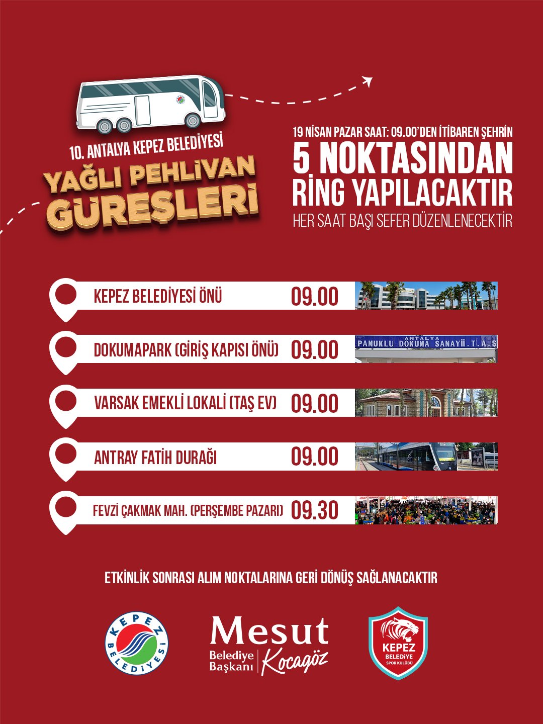 Kepez Belediyesi, 10. Antalya Kepez Belediyesi Yağlı Pehlivan Güreşleri heyecanına ortak olmak isteyen vatandaşlar için ulaşım kolaylığı sağlıyor. Belediye tarafından yapılan resmi duyuruda, şehrin stratejik noktalarından güreş alanına ücretsiz ring seferlerinin düzenleneceği bildirildi.