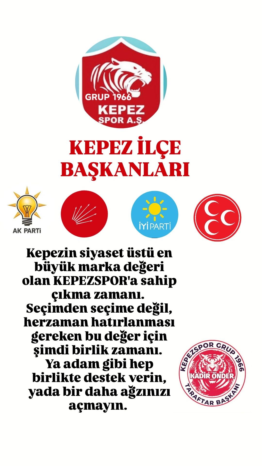 Açıklamanın en dikkat çeken bölümü ise sert üslubuyla öne çıktı. Taraftarlar adına yapılan çağrıda, “Ya adam gibi hep birlikte destek verin, ya da bir daha ağzınızı açmayın” ifadeleri kullanıldı. Bu sözler, kulübe yönelik dönemsel ilgiye tepki olarak yorumlandı. Mesajın altında Kepezspor Grup 1966 ve “Taraftar Başkanı” olarak belirtilen Kadir Önder ismi yer aldı. Bu durum, çağrının doğrudan taraftar grupları tarafından organize edildiğini gösteriyor.