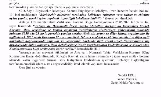 Ayrıca izinsiz uygulamaların ilgili belediye tarafından kaldırılması ve yapılan işlemler hakkında Komisyona bilgi verilmesi karara bağlandı. Sürecin hızlandırılması istendi. Kararda izinsiz tarımsal faaliyetlerin öncelikli işlem olarak değerlendirilip ivedilikle kaldırılması gerektiğini vurguladı. Komisyon kararı kapsamında harekete geçen Antalya Su ve Atık Su İdaresi Genel Müdürlüğü (ASAT), Döşemealtı Belediyesi'ne yazı yazarak izinsiz yapılan muz serasının yıkılmasını istedi. Seranın bu hafta içerisinde yıkılmasının beklendiği öğrenildi.