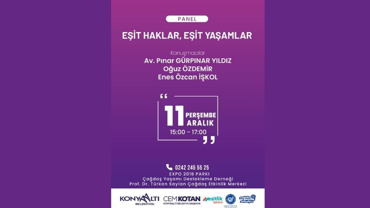 Konyaaltı Belediyesi, ‘Eşit Haklar, Eşit Yaşamlar’ konulu paneli 11 Aralık Perşembe günü EXPO Parkı’nda Çağdaş Yaşamı Destekleme Derneği iş birliğiyle gerçekleştirecek. Tüm halka açık olarak düzenlenecek panelin, kapsayıcılık bilincinin gelişmesine katkı sağlaması hedefleniyor.
