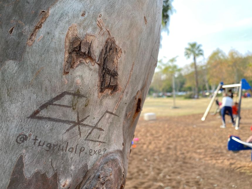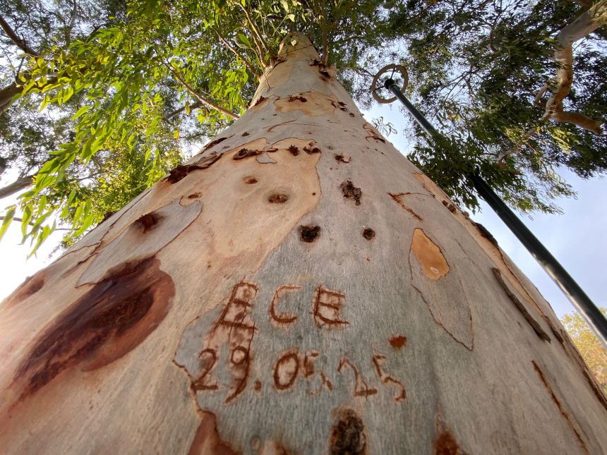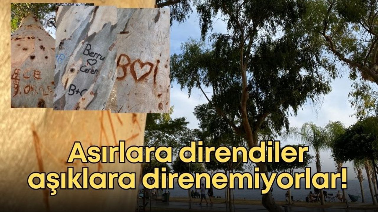 Konyaaltı ilçesinde yaz aylarında gölge sağlayarak sahil yürüyüşlerine nefes olan asırlık okaliptüs ağaçları, son dönemlerde genç çiftlerin kazıdığı yazı ve kalp sembolleri nedeniyle zarar gördü.