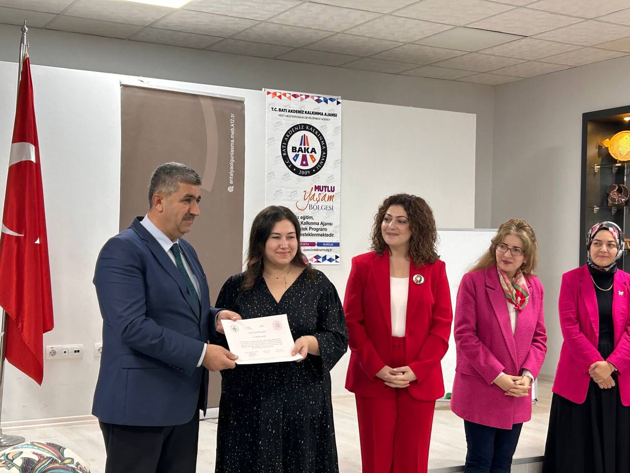 Eğitim sonunda başarılı kursiyerlere sertifikaları takdim edildi. Sertifika törenine BAKA Antalya Yatırım Destek Ofisi Koordinatörü Jale Akhundova Demir, Muratpaşa İlçe Milli Eğitim Müdürü Mustafa Coşkunsu, Antalya Olgunlaşma Enstitüsü Müdürü Emine Erkal, BAKA uzmanı İffet Gözde Bozdoğan ve enstitü yetkilileri katıldı.