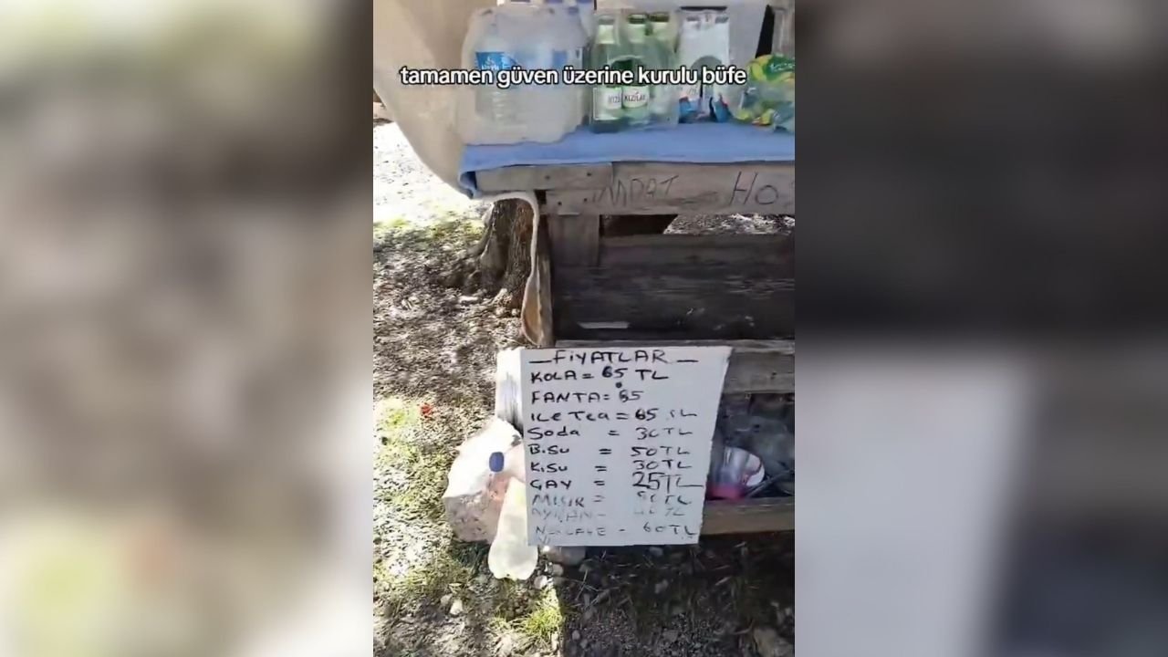 Görüntüyü paylaşan kişi videoda, “Bakın dağların arasında Likya Yolu güzergahında biri büfe yapmış. Buraya fiyatlarını yazmış, tamamen güven üzerine kurulu. Bir de kasa koymuş. Buradan istediklerinizi alıp parasını kasaya koyuyorsunuz” ifadelerini kullandı.