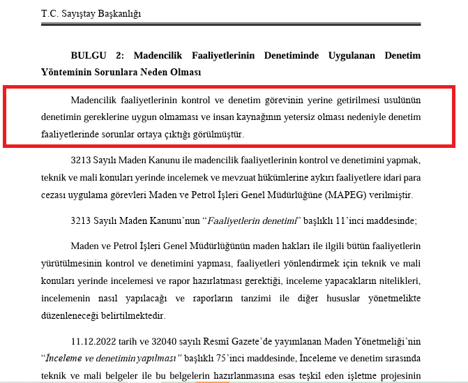 Ancak Enerji ve Tabii Kaynaklar Bakanlığı’na bağlı Maden ve Petrol İşleri Genel Müdürlüğü’nde (MAPEG) yapılan Sayıştay denetiminde, maden işletmelerindeki denetimlerin yetersiz olduğu ortaya çıktı. Sayıştay’ın Ekim 2025 tarihli denetim raporunda, 3213 Sayılı Maden Kanunu’nun, maden hakları ile ilgili teknik ve mali denetim ve kontrol yetkisini MAPEG’e verdiği belirtilerek şöyle denildi: “Maden ve Petrol İşleri Genel Müdürlüğünün maden hakları ile ilgili bütün faaliyetlerin yürütülmesinin kontrol ve denetimini yapması, faaliyetleri yönlendirmek için teknik ve mali konuları yerinde incelemesi ve rapor hazırlatması gerektiği, inceleme yapacakların nitelikleri, incelemenin nasıl yapılacağı ve raporların tanzimi ile diğer hususlar yönetmelikte düzenleneceği belirtilmektedir. Mevzuatta görüldüğü gibi madencilik faaliyetlerinin teknik ve mali olarak iki kısımda denetlenmesi gerekmektedir. Teknik faaliyetler; İşletme projesi ve onaylı haritalar, patlayıcı kullanımı, yeraltı ocaklarında havalandırma planları, ocak sahasında imalat haritasının üretilmesine yönelik ölçüm yapılması… gibi maden mühendisi, jeoloji mühendisi, harita mühendisi, tekniker tarafından incelenmesi uygun olan faaliyetlerdir. Mali belgeler ise üretim ve satış raporları, sevk fişleri, faturalar, satış belgeleri gibi mali konularda uzmanlaşmış personel tarafından incelenmesi uygun olan belgelerdir.”