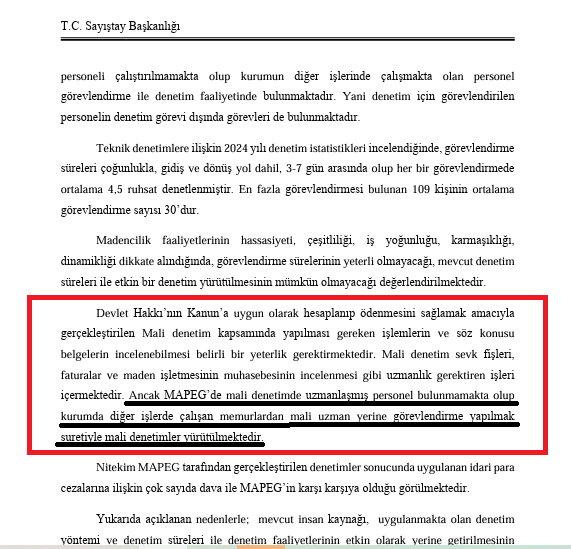 Madencilik faaliyetlerinin hassasiyeti, çeşitliliği, iş yoğunluğu, karmaşıklığı ve dinamikliği dikkate alındığında, görevlendirme sürelerinin yeterli olmadığı gibi, mevcut denetim süreleri ile etkin bir denetim yürütülmesinin de mümkün olmayacağının altı çizilen Sayıştay raporunda, “Devlet Hakkı’nın Kanun’a uygun olarak hesaplanıp ödenmesini sağlamak amacıyla gerçekleştirilen Mali denetim kapsamında yapılması gereken işlemlerin ve söz konusu belgelerin incelenebilmesi belirli bir yeterlik gerektirmektedir. Mali denetim sevk fişleri, faturalar ve maden işletmesinin muhasebesinin incelenmesi gibi uzmanlık gerektiren işleri içermektedir. Ancak MAPEG’de mali denetimde uzmanlaşmış personel bulunmamakta olup kurumda diğer işlerde çalışan memurlardan mali uzman yerine görevlendirme yapılmak suretiyle mali denetimler yürütülmektedir” denildi.