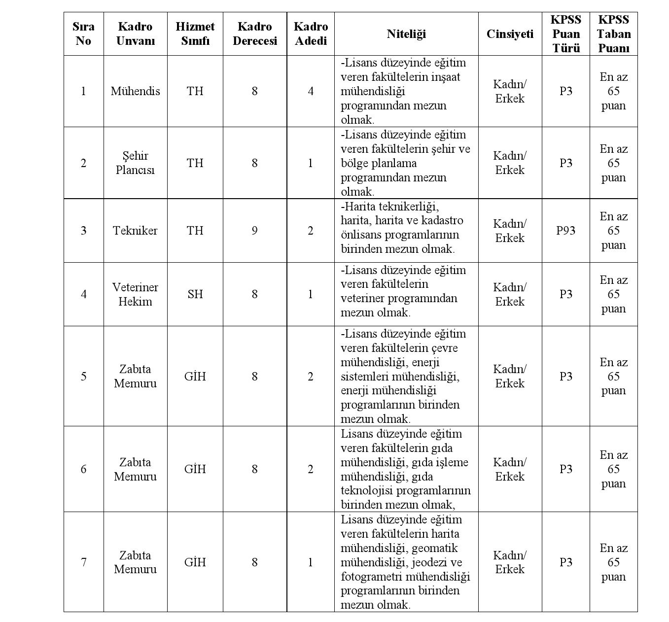 Manavgat Belediye Başkanlığı tarafından yayımlanan resmi ilana göre, adayların belirli Kamu Personeli Seçme Sınavı (KPSS) puan türlerinden belirlenen taban puanı almış olmaları gerekiyor. Alım yapılacak kadrolar şu detayları içeriyor: