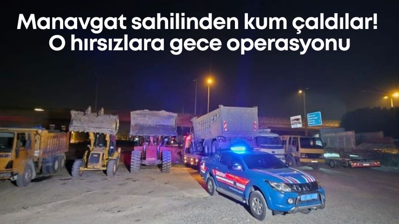 Antalya Manavgat İlçe Jandarma Komutanlığı Merkez Karakolu ekipleri, vatandaşlardan gelen ihbar üzerine Mendirek mevkiinde kum hırsızlarına operasyon düzenledi. Bölgede kum yüklediği belirlenen iş makinelerine ve kamyonlara el konuldu.