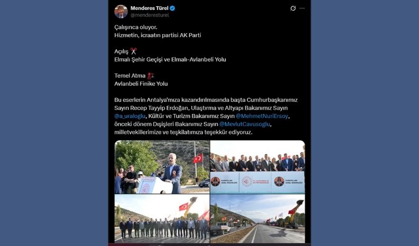 AK Parti MKYK Üyesi Menderes Türel, Antalya’da tamamlanan ve temeli atılan yeni ulaşım projeleriyle ilgili sosyal medyadan paylaşımda bulundu. “Çalışınca oluyor, hizmetin ve icraatın partisi AK Parti” diyen Türel, Elmalı Şehir Geçişi ve Elmalı-Avlanbeli Yolu’nun açılışının gerçekleştirildiğini belirtti.