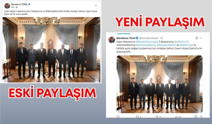 AK Parti kulislerinde uzun süredir Türel ile Çavuşoğlu arasında fikir ayrılıkları olduğu konuşuluyor. Son genel kurulda aynı arabada Ankara’ya gidip birlik pozu verseler de, aralarındaki mesafenin sürdüğü iddia ediliyor. Konuya ilişkin www.antalyakorfez.com internet haber sitemizde, “Menderes Türel’den Mevlüt Çavuşoğlu’na ince mesaj! Bakan mı, vekil mi” başlıklı haberimizin ardından Menderes Türel, geri vites yaptı. Yeni bir paylaşımda bulunan Türel, daha önce milletvekilimiz dediği Mevlüt Çavuşoğlu’nu terfi ettirerek "Bakanımız" ifadesini kullandı.