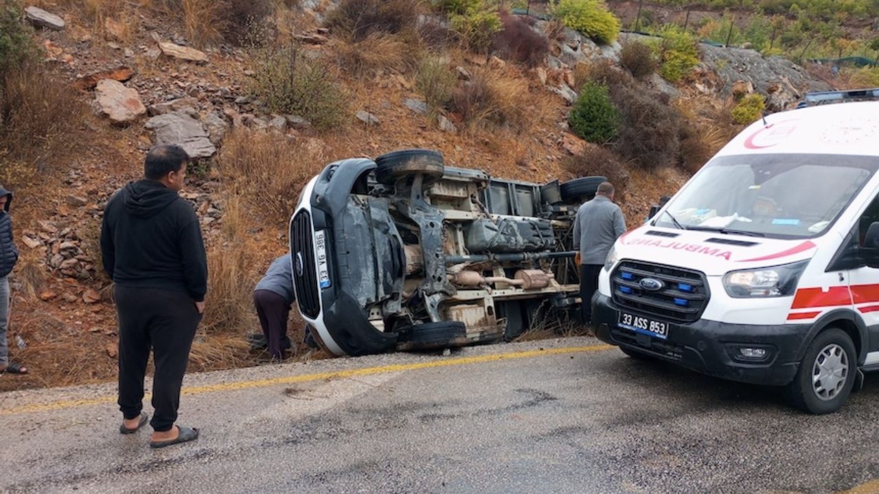 Alınan bilgiye göre, Erdemli istikametine seyreden A.T. yönetimindeki elma yüklü 33 VG 386 plakalı kamyonet, yağışla kayganlaşan yolda sürücüsünün direksiyon hakimiyetini kaybetmesiyle şarampole devrildi.