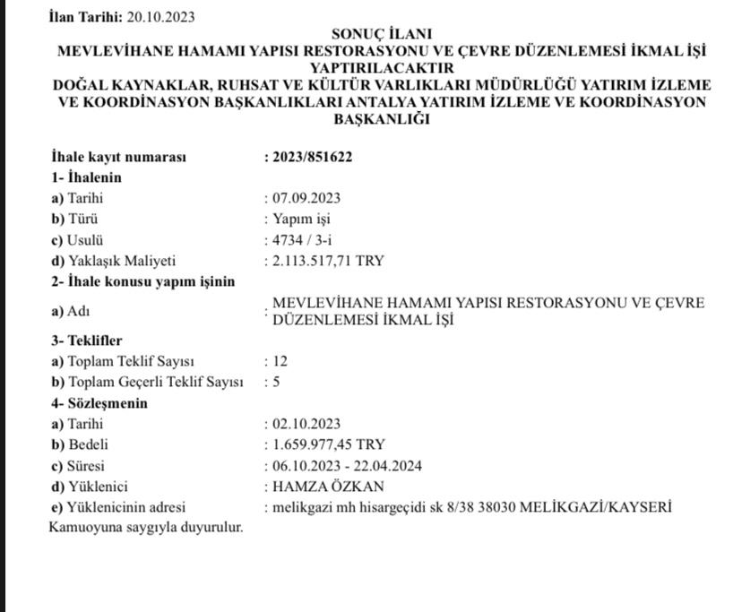 Antalya’nın tarihi merkezinde yer alan Mevlevihane Hamamı’nın restorasyon ihalesi, yüklenici firma ile idare arasında karşılıklı talepler doğrultusunda feshedildi. Ekim 2023’te 1 milyon 659 bin 977 TL bedelle verilen ve 22 Nisan 2024’te tamamlanması gereken proje süresinde bitirilemedi. Son dönemde Antalya’da Eski Merkez Bankası Binası ve Korkuteli Çaybaşı Hamamı ihalelerinde de benzer fesihlerin yaşandığı, artan maliyetler ve ekonomik koşullar nedeniyle firmaların taahhüt edilen bedellerle işleri tamamlamakta zorlandığı belirtiliyor.