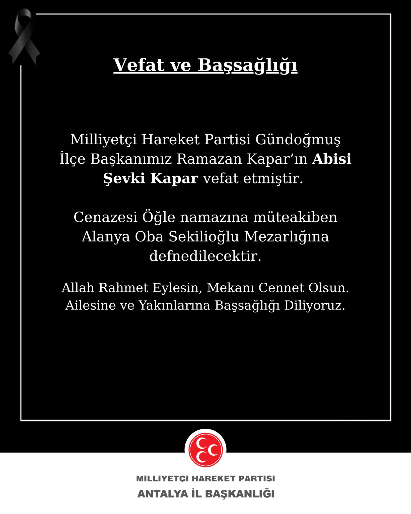 MHP Antalya İl Başkanlığı açıklamasında, “Allah rahmet eylesin, mekânı cennet olsun. Ailesine ve yakınlarına başsağlığı diliyoruz” ifadelerine yer verildi. Merhuma Allah’tan rahmet, Kapar ailesine sabır temennisinde bulunuldu.