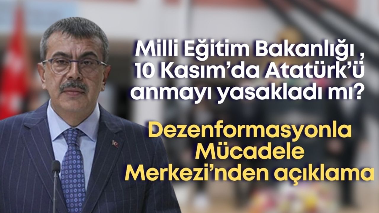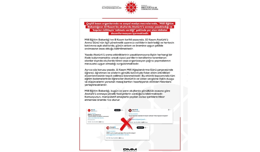 İletişim Başkanlığı Dezenformasyonla Mücadele Merkezi (DMM), “Milli Eğitim Bakanlığı’nın 10 Kasım’da okullarda Atatürk’ü anmayı yasakladığı ve ‘kapıları kilitleyin’ talimatı verdiği” yönündeki iddiaların gerçeği yansıtmadığını duyurdu.
