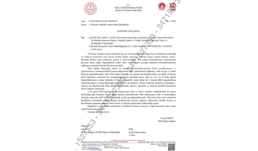 Bakanlığın aynı yazısında ayrıca, 11 Kasım Milli Ağaçlandırma Günü kapsamında öğrenci, öğretmen ve ailelerin gönüllü katılımıyla fidan dikim etkinlikleri düzenlenmesinin teşvik edildiği hatırlatıldı. Bu etkinliklerde öğrencilerin, Atatürk’e ve vatan sevgisine ilişkin duygu ve düşüncelerini mesaj kartlarına yazarak diktikleri fidanlara yerleştirdikleri bildirdi.