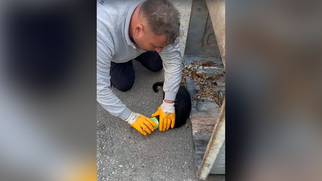 Olay, sabah saatlerinde Muğla’nın Bodrum ilçesinde Yokuşbaşı Mahallesi’nde meydana geldi. Bölgede temizlik çalışması yapan Bodrum Belediyesi temizlik personeli, çöp konteynerinin içerisinde başı konserve kutusuna sıkışmış bir kedi olduğunu fark etti.