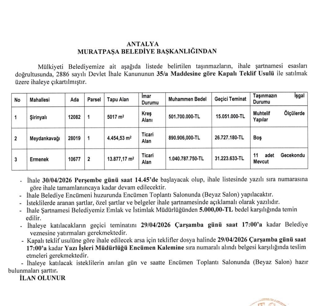 Antalya'nın merkez ilçelerinden Muratpaşa Belediye Başkanlığı, Şirinyalı, Meydankavağı ve Ermenek Mahallelerinde bulunan yüksek değerli taşınmazlarını satışa çıkardı. 2886 sayılı Devlet İhale Kanunu’nun 35/a maddesi gereğince gerçekleştirilecek olan ihale, kapalı teklif usulü ile yapılacak. Satış listesinde en dikkat çeken parsel ise 1.040.787.750 (1 milyar 40 milyon 787 bin 750) Türk Lirası muhammen bedel ile Ermenek Mahallesi’ndeki ticari alan oldu.