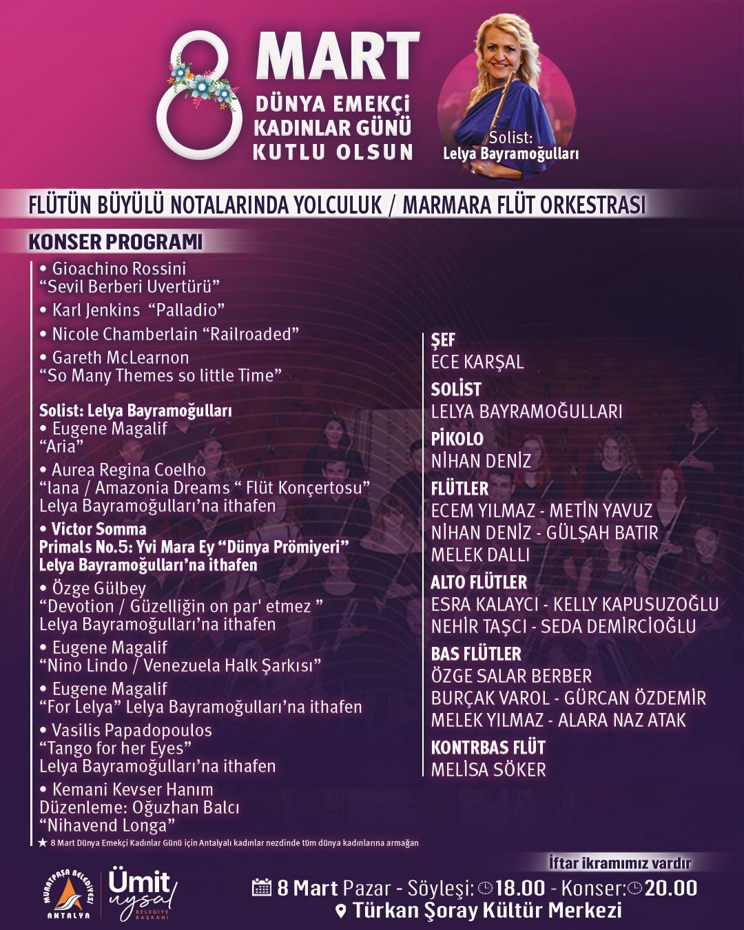 Antalya Muratpaşa Belediye Başkanı Ümit Uysal, 8 Mart Dünya Emekçi Kadınlar Günü’nü sanatın birleştirici gücüyle kutlamaya hazırlanıyor. Türkan Şoray Kültür Merkezi’nde gerçekleşecek olan "Flütün Büyülü Notalarında Yolculuk" konseriyle, kadınların emeği ve gücü müzik dolu bir gecede selamlanacak. Şef Ece Karşal yönetimindeki Marmara Flüt Orkestrası, dünyaca ünlü solist Lelya Bayramoğulları ile birlikte Antalyalı sanatseverlere unutulmaz bir akşam yaşatacak.