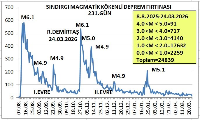 Deprem Bilimci Demirtaş, resmi sosyal medya hesabı üzerinden yaptığı açıklamalarda Balıkesir Sındırgı’daki sismik tabloyu paylaştı. "Sındırgı (Balıkesir) MAGMATİK Kökenli Deprem Fırtınası" başlığıyla süreci özetleyen Dr. Ramazan Demirtaş, sarsıntıların "231. Gün" itibarıyla "Toplam=24 bin 839 deprem" seviyesine ulaştığını duyurdu. Bölgedeki hareketliliği yakından takip eden uzman, fay hatlarına ilişkin yapılan bazı yorumları eleştirdi.