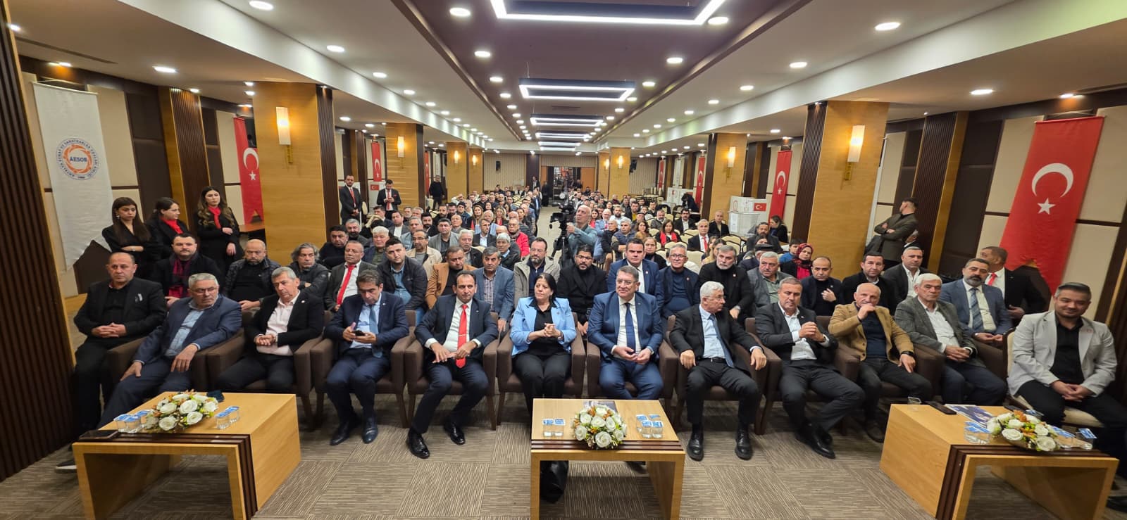 Esnaf ve Sanatkarlar Odaları Birliği (AESOB) toplantı salonunda gerçekleşen genel kurula, kentin siyasi ve sivil toplum temsilcileri adeta çıkarma yaptı. AESOB Başkanı Adlıhan Dere’nin ev sahipliğinde gerçekleşen genel kurula; CHP İl Başkanı Nail Kamacı, İYİ Parti İl Başkanı Ali Adnan Kaya, CHP ilçe başkanları, belediye temsilcileri ve çok sayıda oda başkanı katılım sağlayarak esnaf dayanışmasına destek verdi.