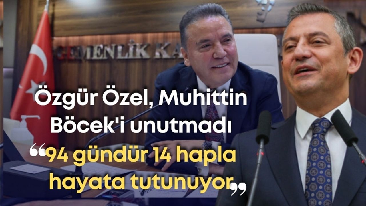 Cumhuriyet Halk Partisi (CHP) Genel Başkanı Özgür Özel, partisinin Türkiye Büyük Millet Meclisi (TBMM) Grup Toplantısı’nda yaptığı konuşmada Antalya Büyükşehir Belediye Başkanı Muhittin Böcek’in sağlık durumuna ve tutukluluğuna dikkat çekti. Özel, “Antalya Büyükşehir Belediye Başkanı Muhittin Böcek’in koltuğu 94 gündür boş. Cezaevinde günde 14 hap içerek yaşama tutunmaya çalışıyor” dedi.